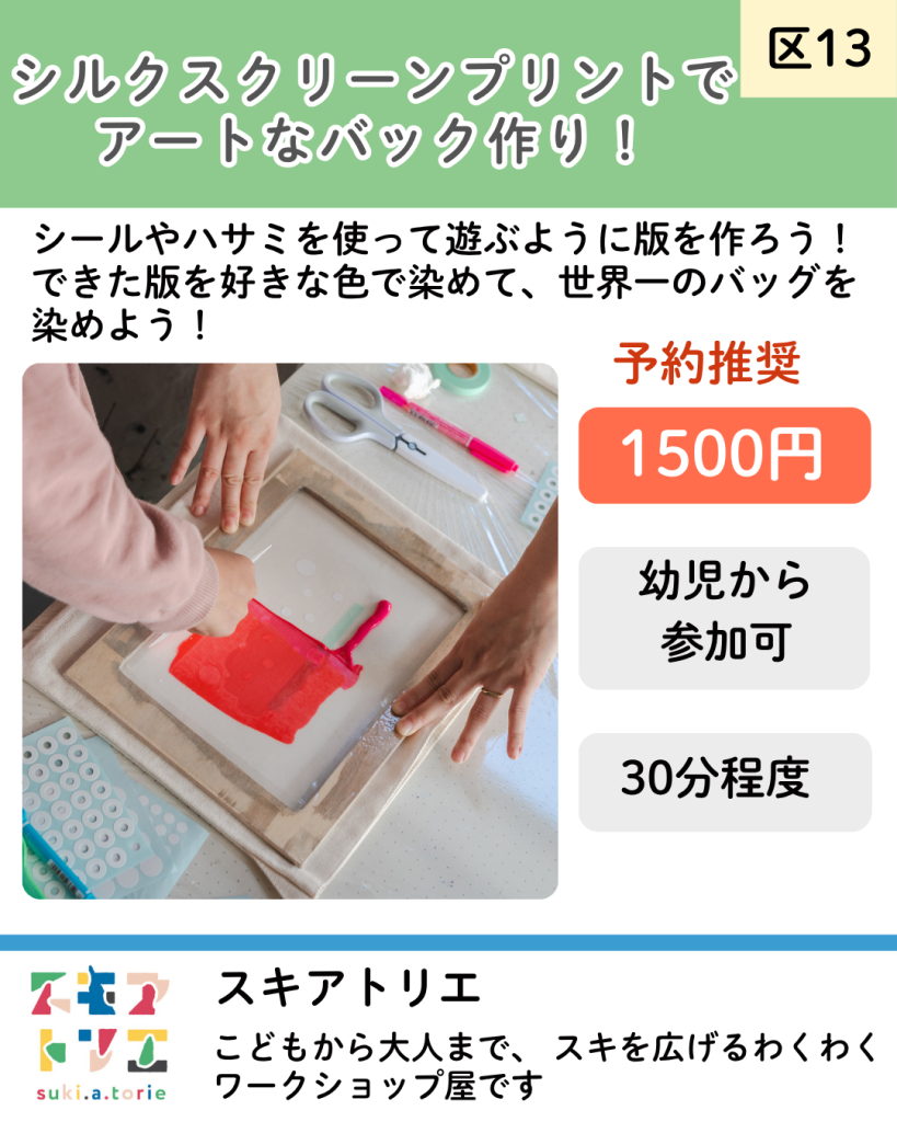 シルクスクリーンプリントでアートなバック作り!申込URL→https://sukiatorie1103.peatix.com