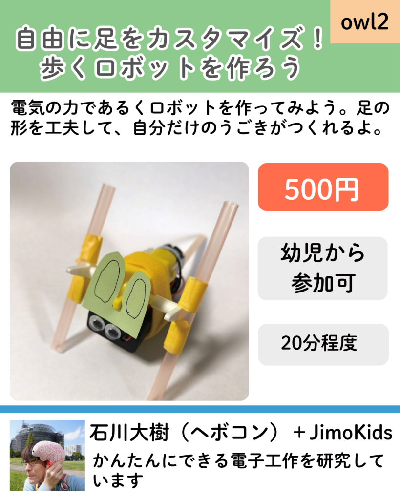 ・自由に足をカスタマイズ!歩くロボットを作ろう(石川大樹(ヘボコン)+JimoKids)